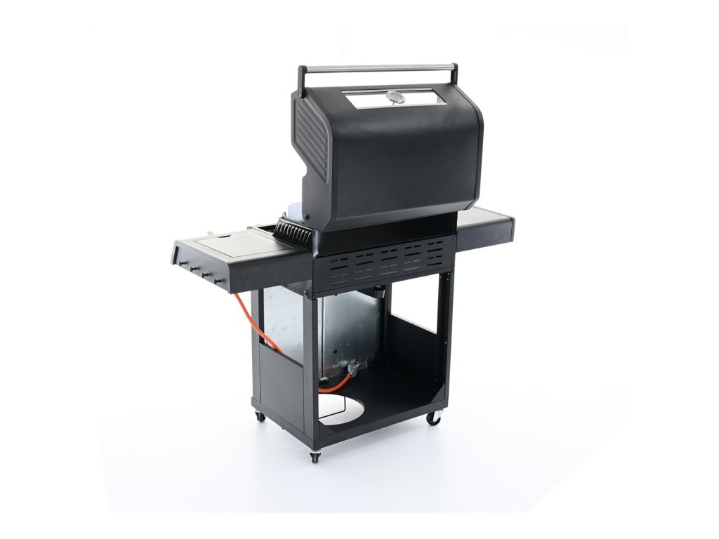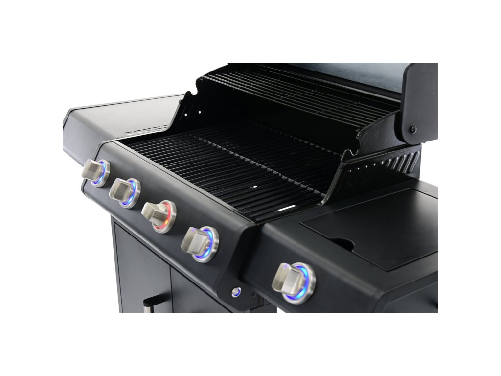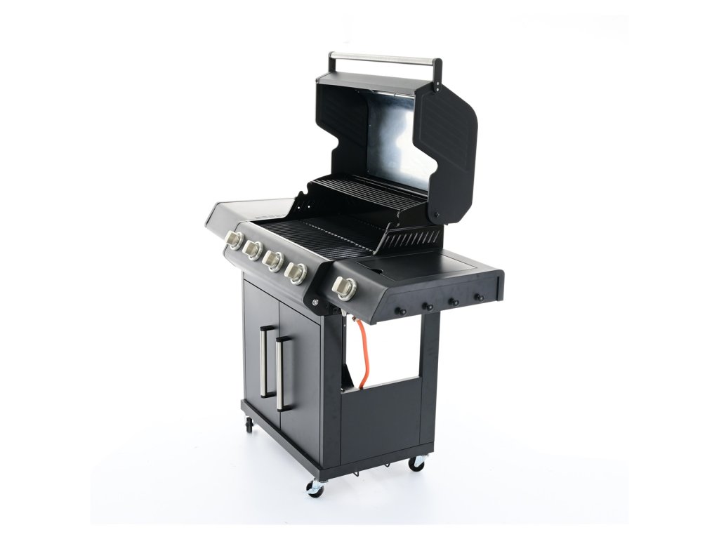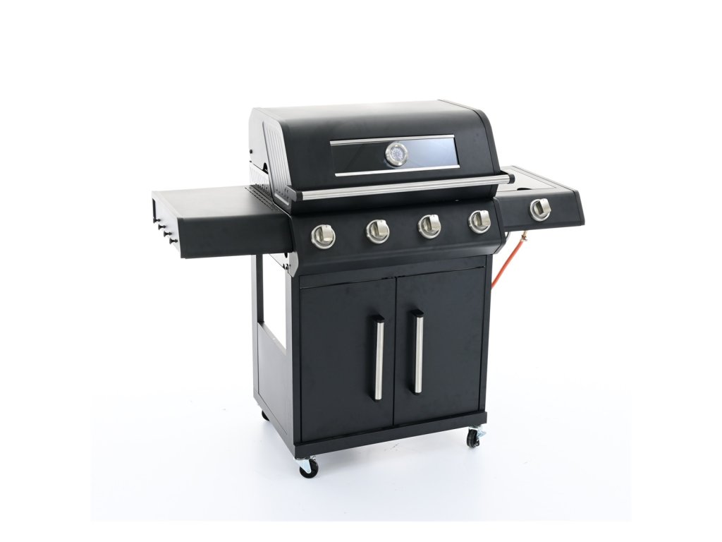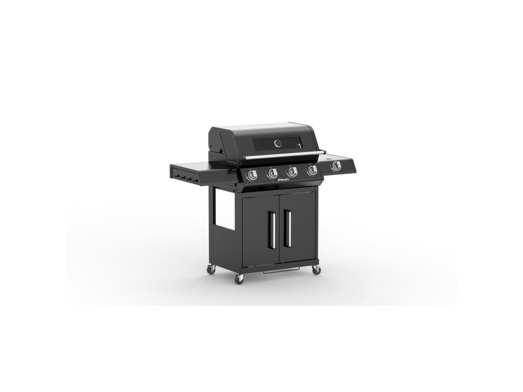 RGG 41 EXL - luxusní plynový gril 17 kW se čtyřmi hořáky a bočním vařičem luxusní plynový gril s robustní konstrukcí a elegantním designem se skvěle hodí jak pro grilování v úzkém rodinném kruhu, tak i pro větší párty a rodinné oslavy skvělá výbava pro pohodlné i zdravé grilování čtyři hlavní, velmi výkonné ploché hořáky z nerezu mají horní kryt i odtok pro odkapávající tuk, díky čemu je zamezeno přepalování tuku a tvorbě škodlivých látek užitečný boční vařič pro přípravu horkých nápojů, omáček nebo příloh lze snadno zakrýt vyklápěcím krytem a může sloužit jako druhý odkládací stolek snadné zapalování hořáků pomocí elektrického piezo zapalování integrovaném v každém z pěti velkých otočných knoflíků. Knoflíky jsou efektně podsvícené LED osvětlením, takže ihned poznáte, zda je hořák v provozu (červená) nebo je vypnutý (modrá) topeniště je pro zvýšení životnosti smaltované, kvalitní grilovací rošt je z odolné litiny další vyklápěcí nerezový rošt se hodí na nepřímé grilování masa, zeleniny nebo na ohřívání již ugrilovaných pokrmů snadno přístupná dvířka do odkládacího prostoru, částečné zakrytování boků pro důkladnou ochranu před větrem integrovaný držák na plynovou láhev uvnitř grilu. Jeho velikost (jako jeden z mála na trhu) mu dovolí pojmout i velké 10 kg plynové lahve. vysoké lakované víko má pro dokonalou izolaci dvojité stěny (lepší udržení stálé teploty), zabudovaný teploměr, velké kovové madlo a průhledné okénko pro rychlou kontrolu pokrmů bez nutnosti otvírat víko odkládací stolek na každé straně grilu. V jednom je integrovaný boční vařič. nezbytné háčky na grilovací náčiní, pojezdová kola, dvě s brzdou elegantní černé lakování, velmi praktické pro tento typ produktu z hlediska údržby i čištění balení obsahuje plynovou hadici i regulátor nutný pro připojení k 5 nebo 10 kg lahvi