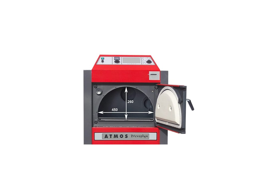 Nejprodávanější kotle Dřevoplyn se vyznačují velkým přikládacím prostorem. Plameny do spodní spalovací komory proudí z horního topeniště zplynovací tryskou s otvory pro přívod vysoce předehřátého sekundárního vzduchu. Dobrou účinnost kotle zajišťuje zadním spalinovým kanálem s výměníkem a odtahovým ventilátorem pro odvod spalin do komína. Těleso kotle ATMOS Dřevoplyn je vyrobeno jako svařenec z kvalitních ocelových plechů o tloušťce 8 až 3 mm.