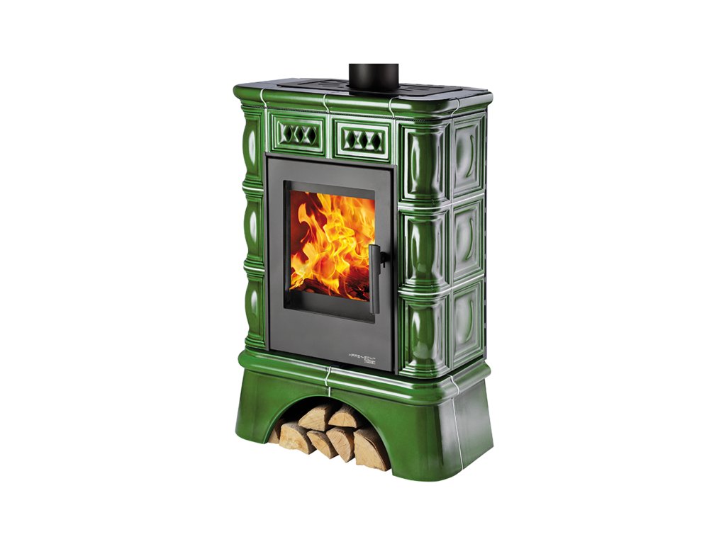 Design a konstrukce: Černé tělo kamen je doplněno kachlemi v odstínu zelená a kachlovým soklem, což dodává interiéru klasický a elegantní vzhled.