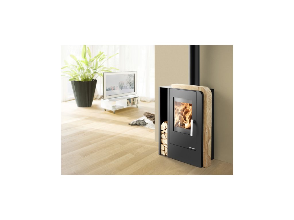 Design a materiály: Černý ocelový korpus je doplněn elegantním půlměsícovým obkladem z přírodního kamene Woodstone Prestige (pískovec), který nejen dodává kamnům luxusní vzhled, ale také akumuluje teplo a postupně ho uvolňuje do místnosti.
