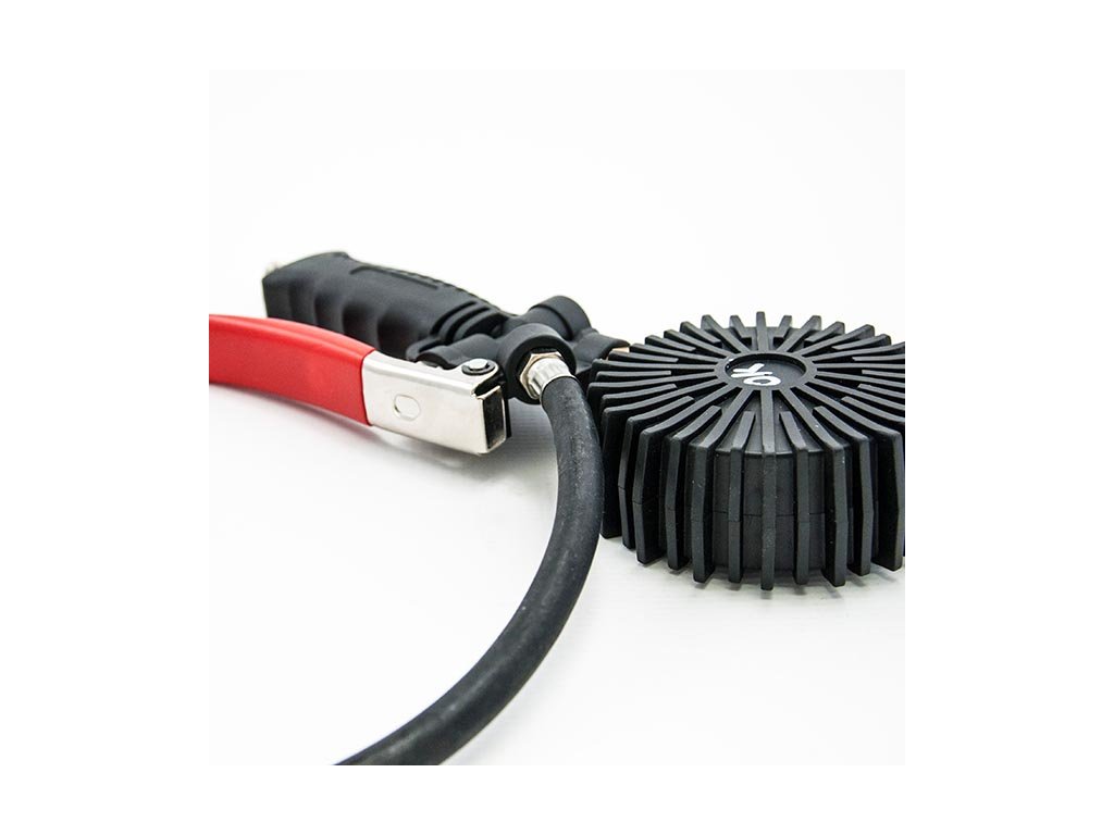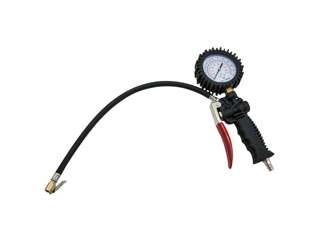 Pistole na huštění pneumatik s manometrem, odpouštěcím ventilem a připojením pro rychlospojku.