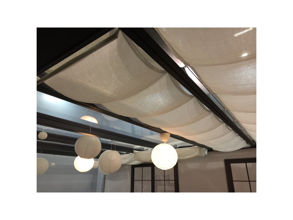 Praktická krémově bílá vícedílná zatahovací zástěna, která se snadno instaluje do drážek profilů pod střechu. V případě slunečného počasí účinně chrání před přílišným přehříváním interiéru.